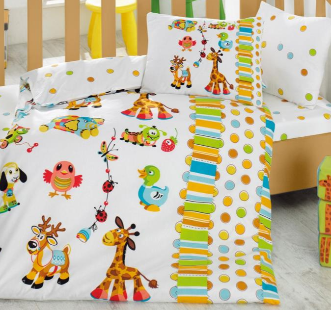 „Playground“ е създаден, за да превърне всяко детско легло в цветен свят на игри и въображение. Десенът включва весели животни – жирафи, патета, еленчета, кученца и птички, съчетани с игриви точки и шарени линии.