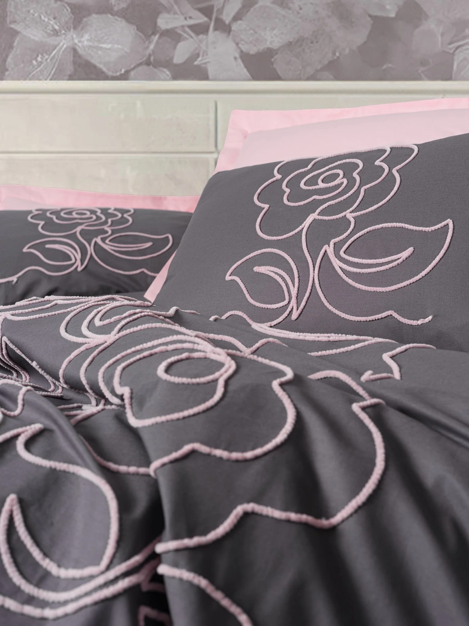 Пликът за завивка е в наситен сив тон, върху който се открояват бродираните цветя с ясно изразен контур и обем. Долният чаршаф е едноцветен, в нежен розов нюанс, който балансира тъмната основа и придава топлина и хармония на цялостната визия.