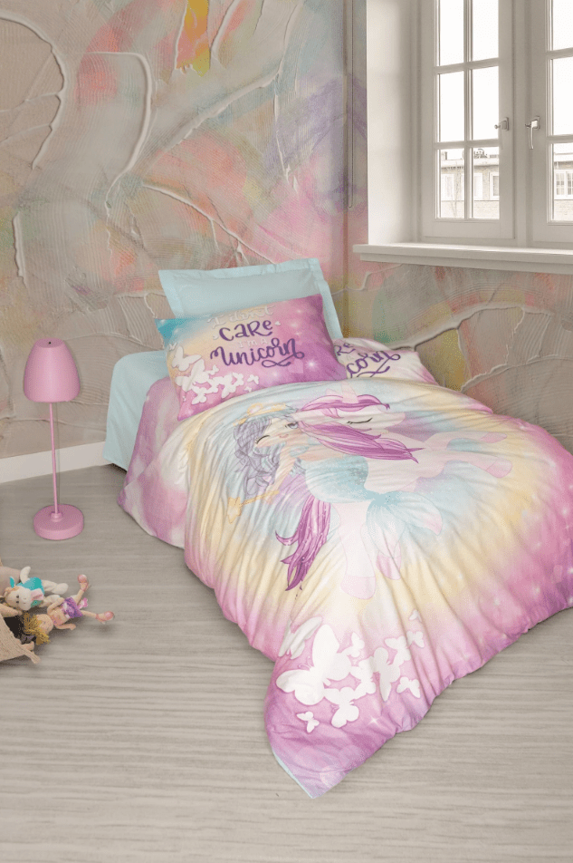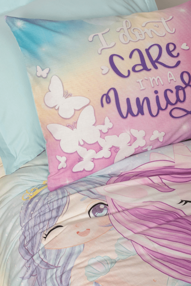 Потопете детската стая във вълшебство с комплекта „Sirena“. Дизайнът съчетава нежна приказна сцена – сладка принцеса с лилава коса и очарователен еднорог, обградени от пеперуди и ефирни детайли. Надписът „I don’t care, I’m a unicorn“ носи игрив и забавен дух, който всяко дете ще обожава.