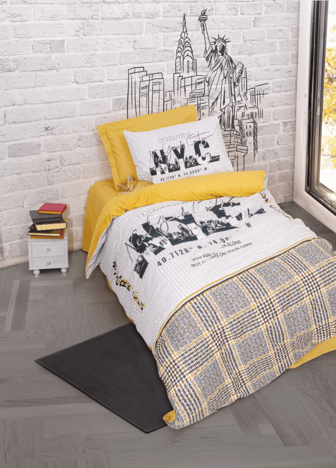 Контрастът между топъл горчица-жълт нюанс и градски сиви тонове придава на комплекта модерен и вдъхновяващ облик, идеален за тийнейджърска или момчешка стая.